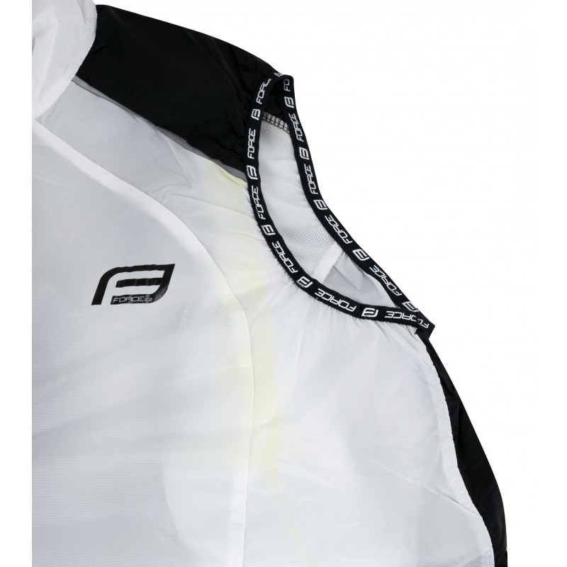 Interior de casaco branco com gola preta e logotipo 'FORCE'