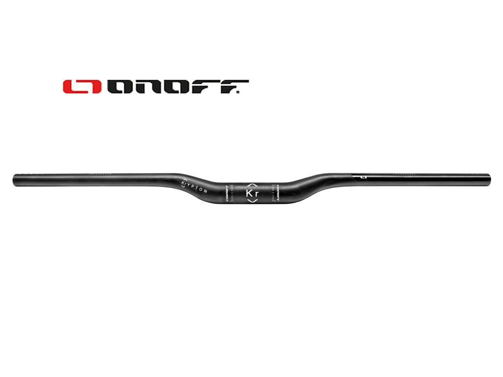 Guiador de bicicleta preto com inscrições ONOFF e Kr