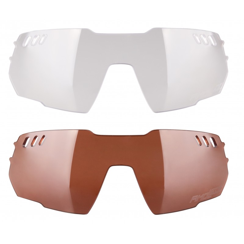 Duas lentes para óculos desportivos, uma transparente e outra castanha, com orifícios nas extremidades